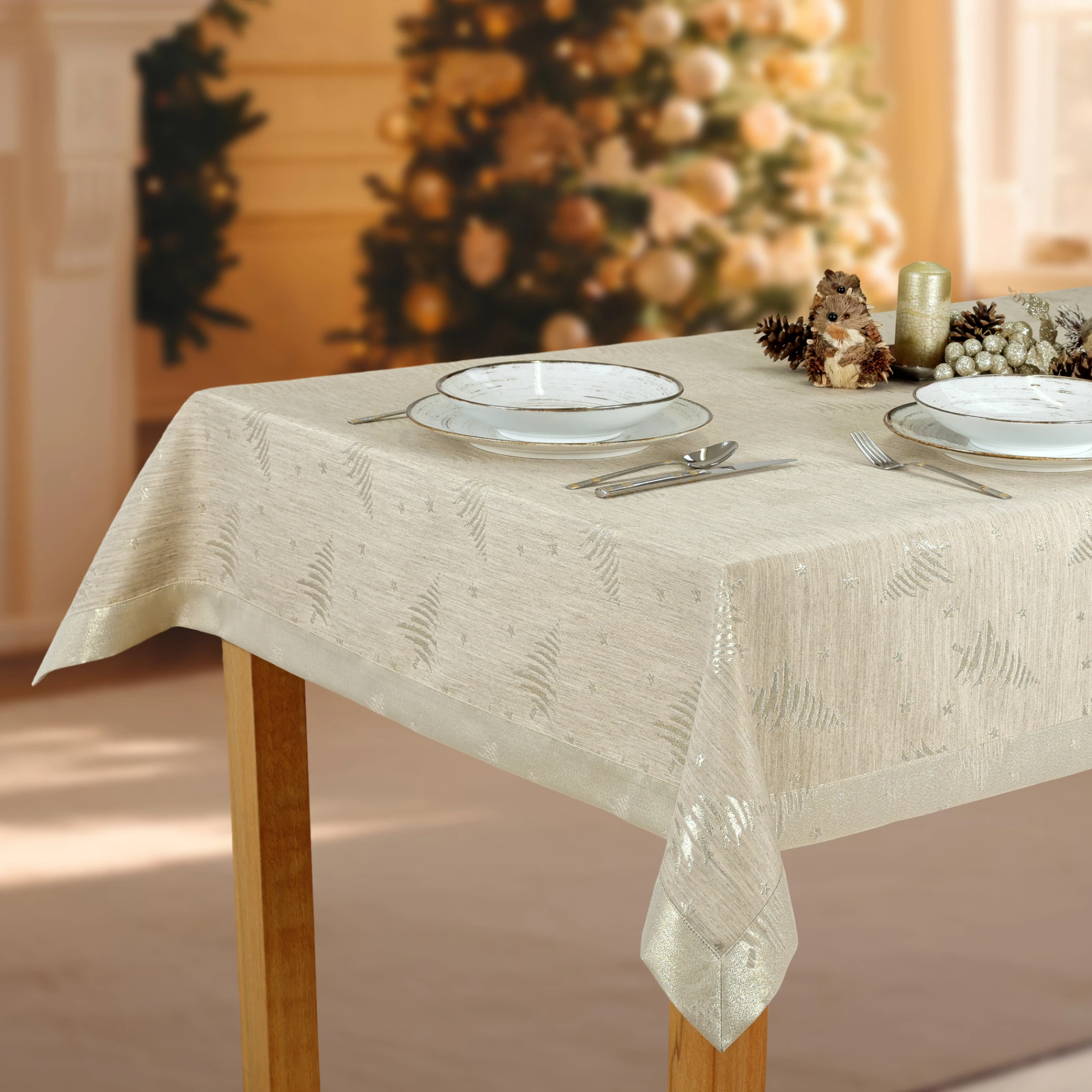 Elegancja na każdą okazję – klasyczny beżl i staranne wykończenie sprawia, że obrus Złote Choinki i Gwiazdki doskonale wpasuje się w wystrój salonu i wszystkich typów eleganckich wnętrz.